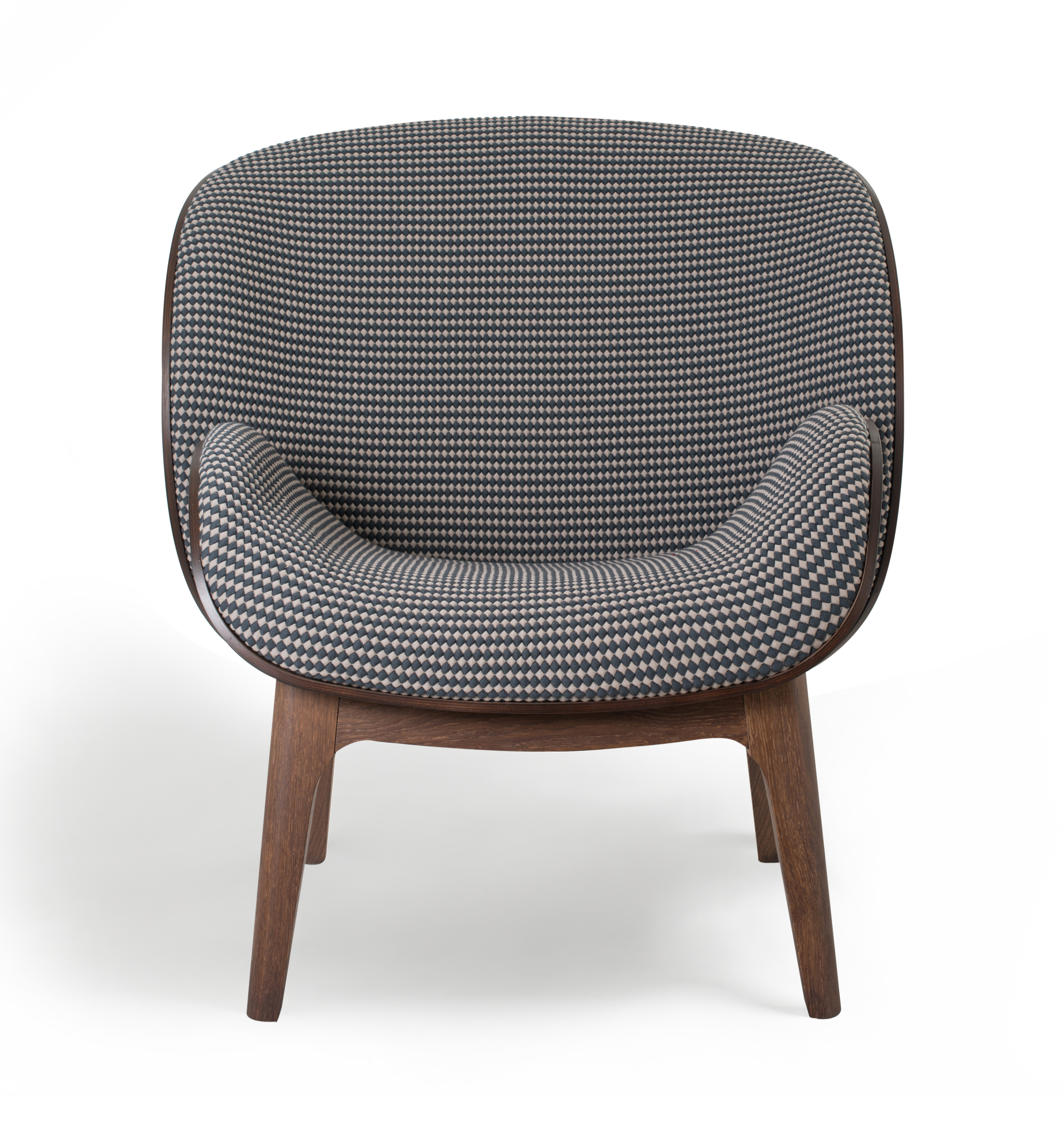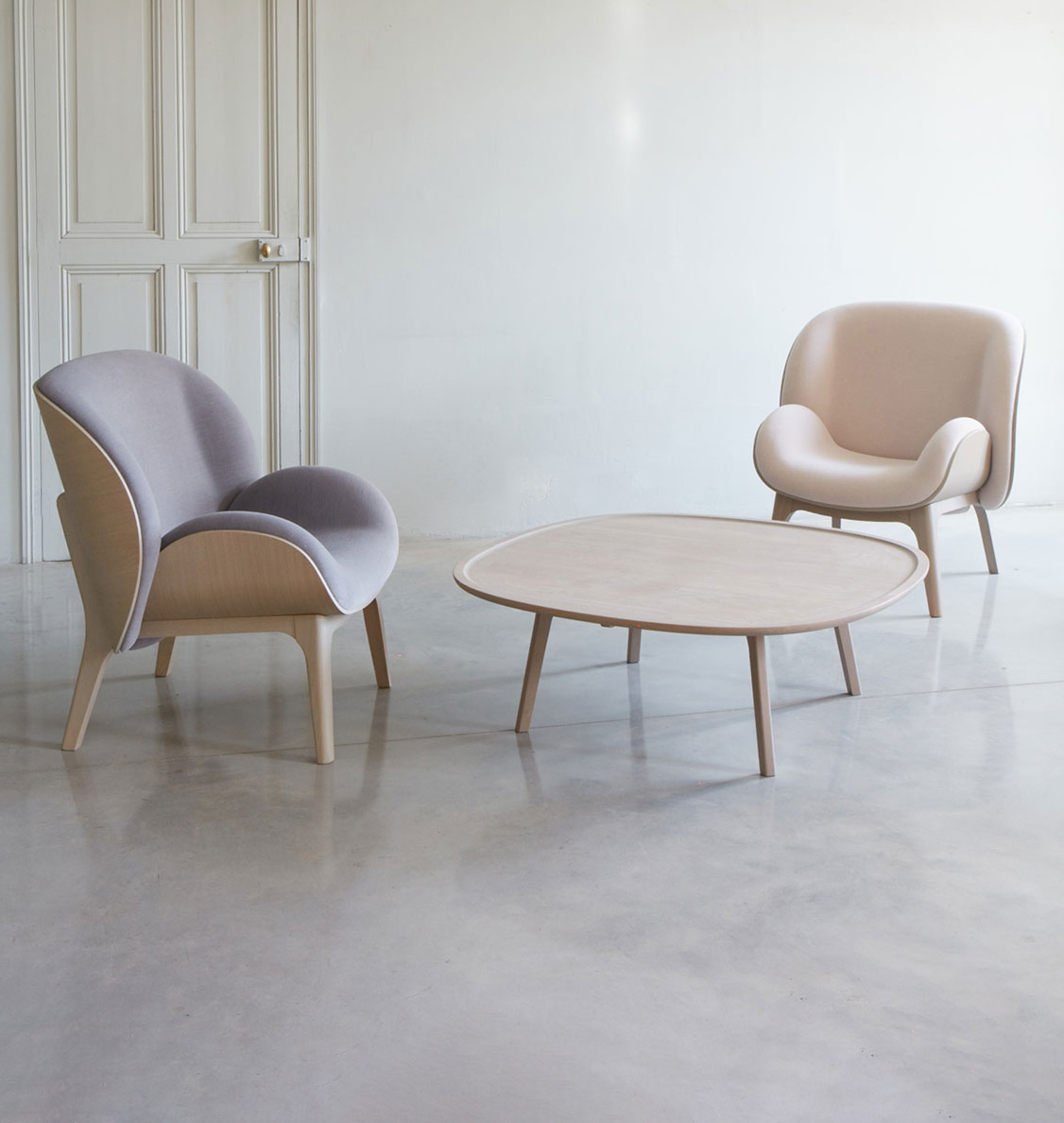 La chauffeuse HUG reprend les proportions accueillantes du fauteuil dans un format plus compact.